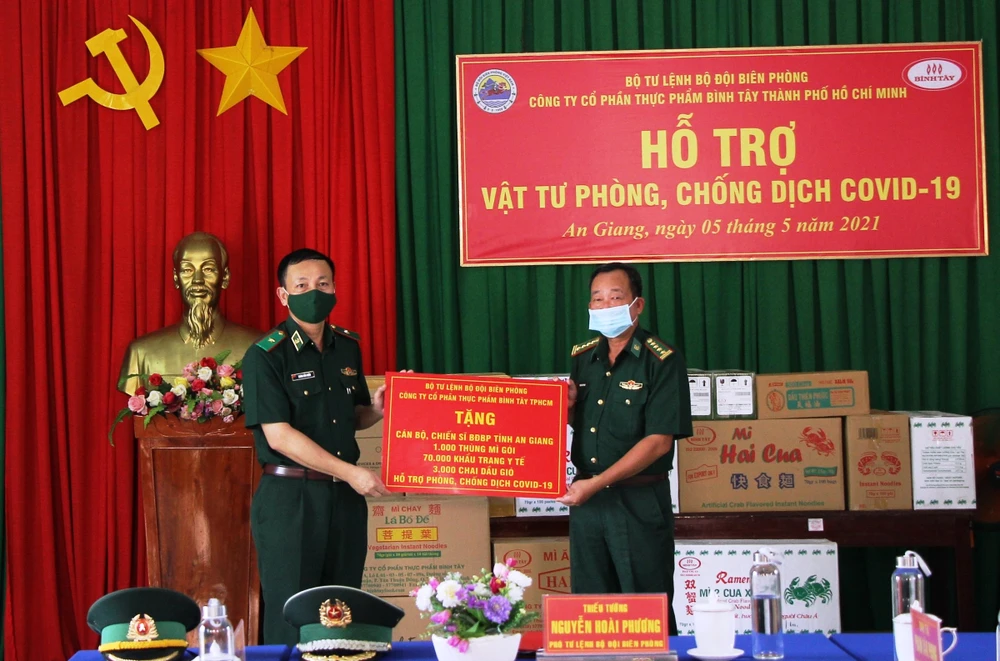 Theo đó, dịp này Bộ Tư lệnh BĐBP đã trao tặng 1.000 thùng mì tôm, 70.000 khẩu trang y tế, 3.000 lọ dầu gió cho các lực lượng Biên phòng, Công an, Quân sự đang thực hiện nhiệm vụ tại các tổ, chốt phòng, chống dịch COVID-19 trên biên giới An Giang. Ước tính toàn bộ số trang bị, vật tư y tế tổng trị giá hơn 100 triệu đồng. Toàn bộ số quà tặng do Công ty cổ phần thực phẩm Bình Tây (TP.HCM) hỗ trợ.
