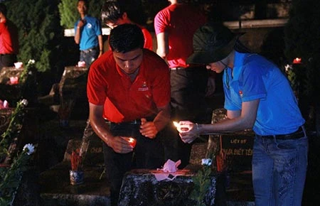 Đoàn viên, sinh viên Hà Giang thắp nến tại các ngôi mộ ở nghĩa trang Vị Xuyên (Hà Giang). Ảnh: TRỌNG PHÚ