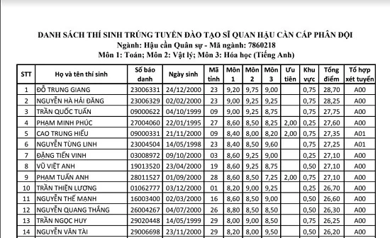 Cụ thể, thủ khoa năm nay của Học viện Hậu cần là em Đỗ Trung Giang - thí sinh của Hòa Bình với tổng điểm là 28,7 xét tuyển bằng khối A00 (Toán 9,2; Vật lý 9,75 và Hóa học 9).