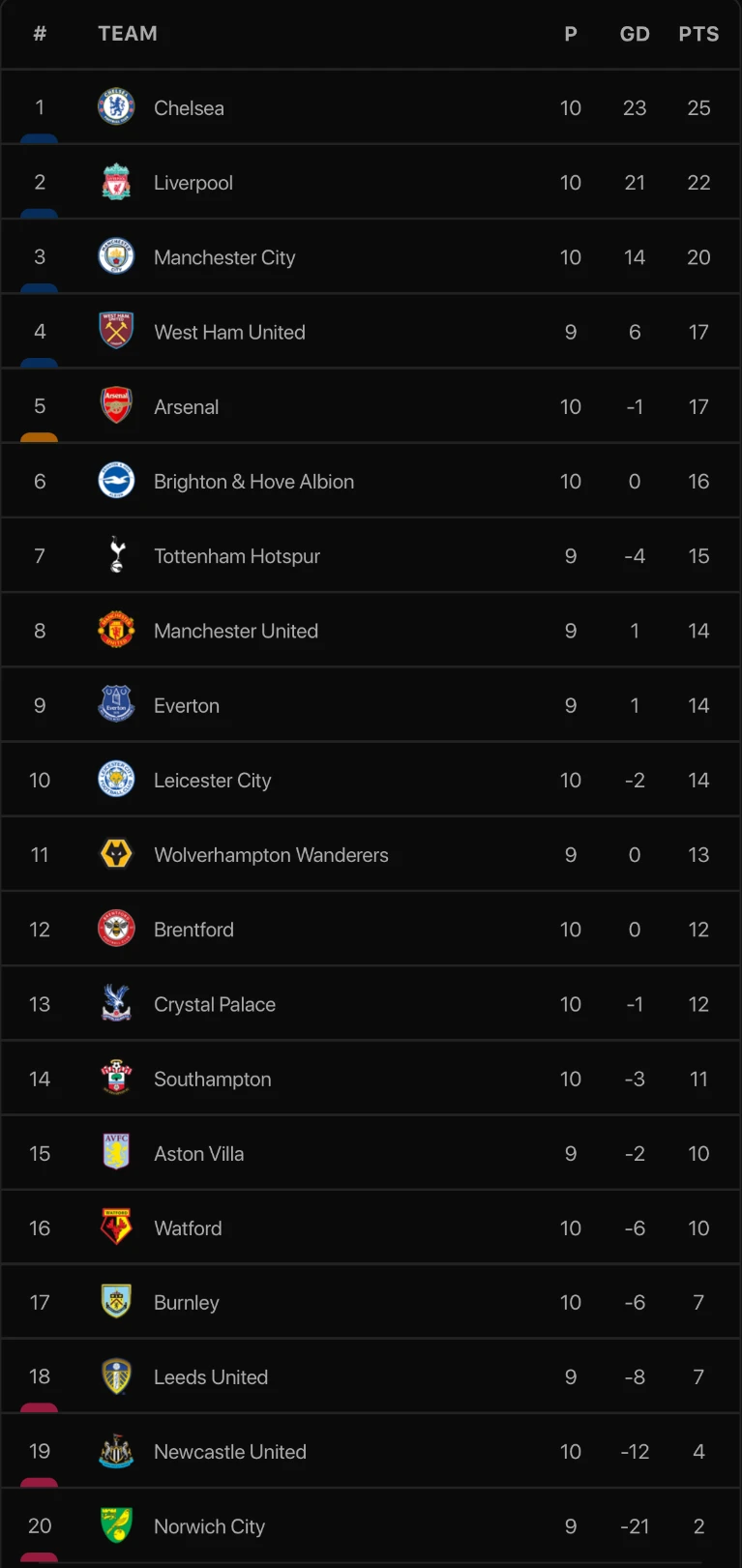 Với kết quả này, Liverpool hụt hơi trong cuộc đua ngôi đầu với Chelsea, khi “The Blues” tại vòng 10 Premier League có chiến thắng 3-0 trên sân của Newcastle. Sau 10 vòng đấu, Chelsea có được ngôi đầu bảng với 25 điểm, Liverpool xếp thứ hai với 22 điểm. Cũng tại vòng 10 Premier League, Arsenal đánh bại chủ nhà Leicester City với tỷ số 2-0 để vươn lên vị trí thứ 5 khi có được 17 điểm.