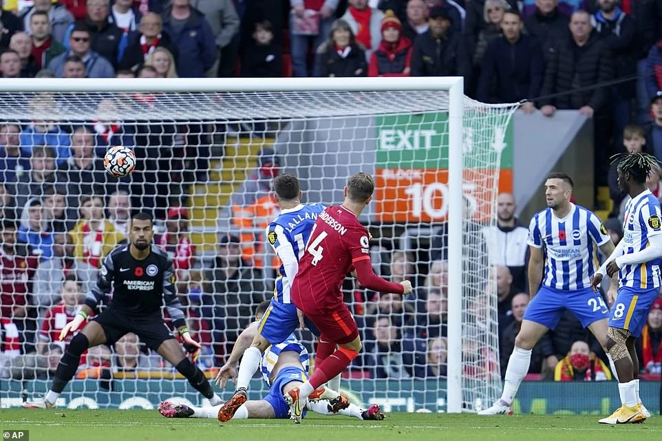 Từ tình huống phản công, cựu cầu thủ của Liverpool là Lallana có đường chọc khe cho Trossard thoát xuống vòng cấm, trung phong của Brighton dùng kỹ thuật loại bỏ Robertson trước khi dứt điểm vào góc hẹp gỡ hòa 2-2 cho Brighton.