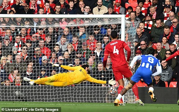 Alisson bay người cản phá cú sút của Bissouma ở phút 15. Ảnh: Getty Images.