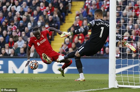 Mane có lần thứ hai làm rung lưới Brighton nhưng bàn thắng của cầu thủ này không được công nhận do lỗi để bóng chạm tay. Ảnh: Reuters.