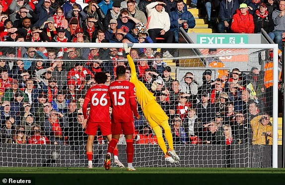 Từ đường phất bóng ở phần sân nhà của trung vệ Van Dijk, Salah đón được bóng và xâm nhập vòng cấm của Brighton. Chân sút người Ai Cập sau đó có đường chuyền về cho tuyến hai, để đội trưởng Henderson băng lên dứt điểm mở tỷ số 1-0 cho Liverpool.