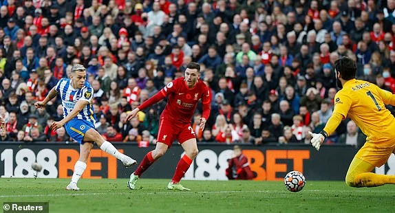 Dù nhận bàn thua sớm, nhưng Brighton vẫn thi đấu bình tĩnh và có được cơ hội nguy hiểm ở phút 15 với cú sút của Bissouma buộc thủ môn Alisson của Liverpool phải đổ người cứu thua.
