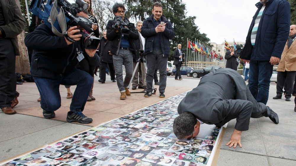 Người phát ngôn đoàn đàm phán phe đối lập Syria Salem al-Mislet hôn bức ảnh in hình các nạn nhân chiến tranh Syria trước trụ sở LHQ ở Geneva (Thụy Sĩ) ngày 2-2. (Ảnh: AP)