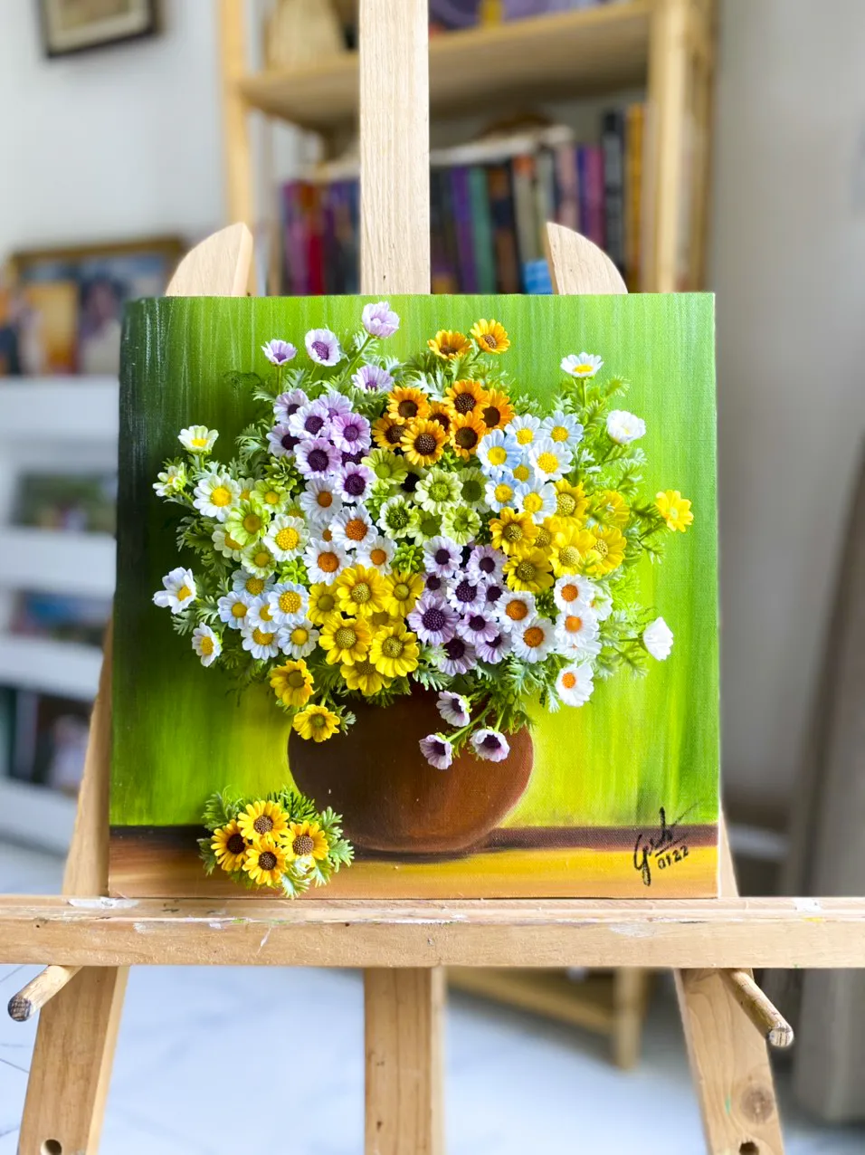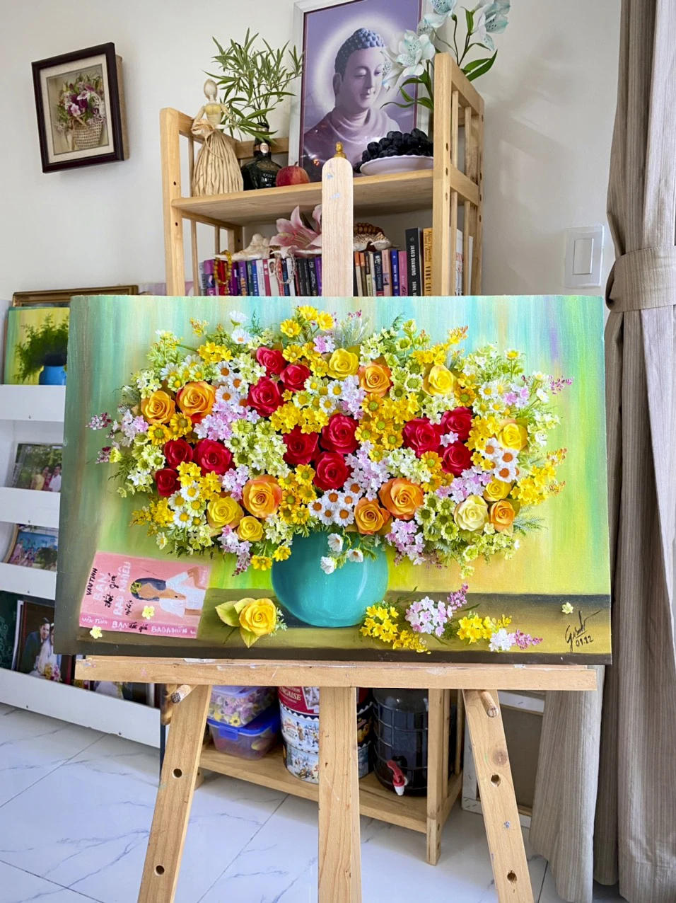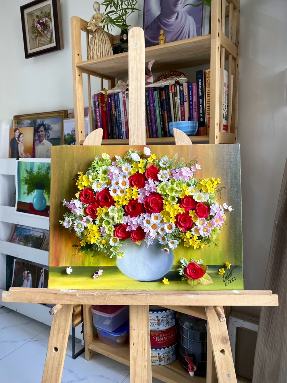 Qua bàn tay khéo léo của chị Sinh, những bông hoa làm từ đất sét như được thổi hồn để 'nở hoa' ngay trên những bức tranh sơn dầu. Nhiều người biết đến tranh của chị Sinh sau khi chị chia sẻ các tác phẩm của mình lên mạng xã hội. Từ đó, hơn một năm nay, chị Sinh nhận về ngày một nhiều đơn hàng vì sự đón nhận nhiệt tình của người yêu nghệ thuật.