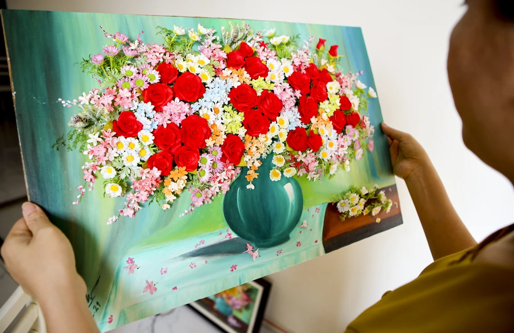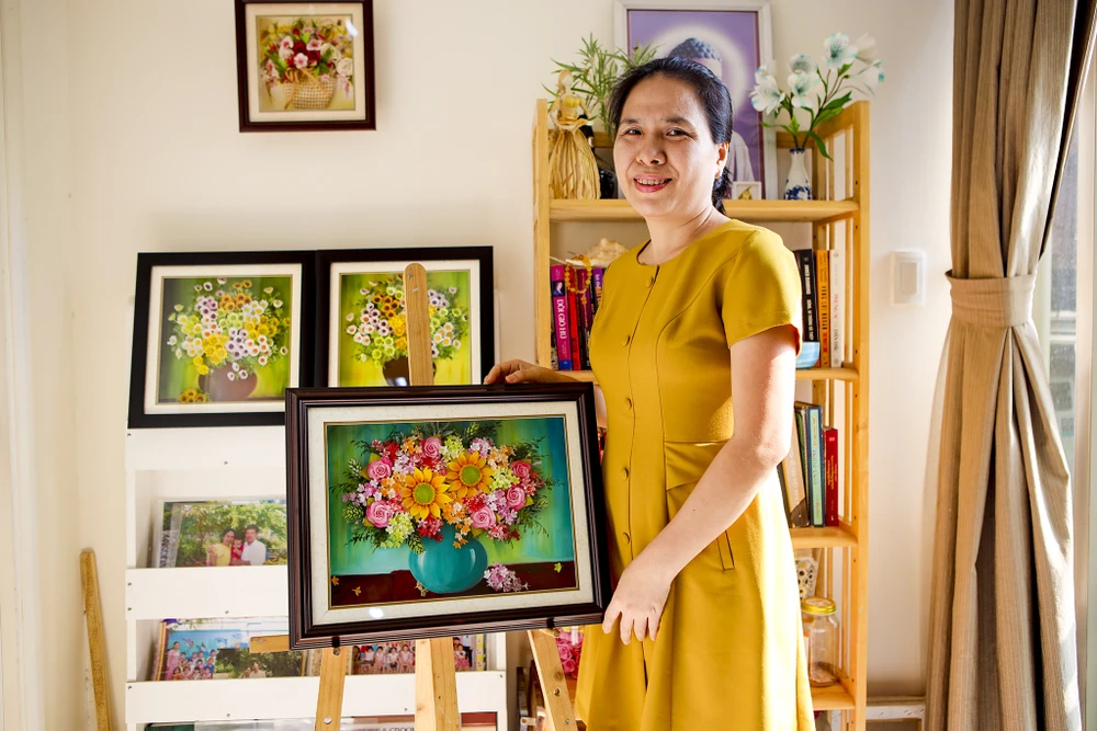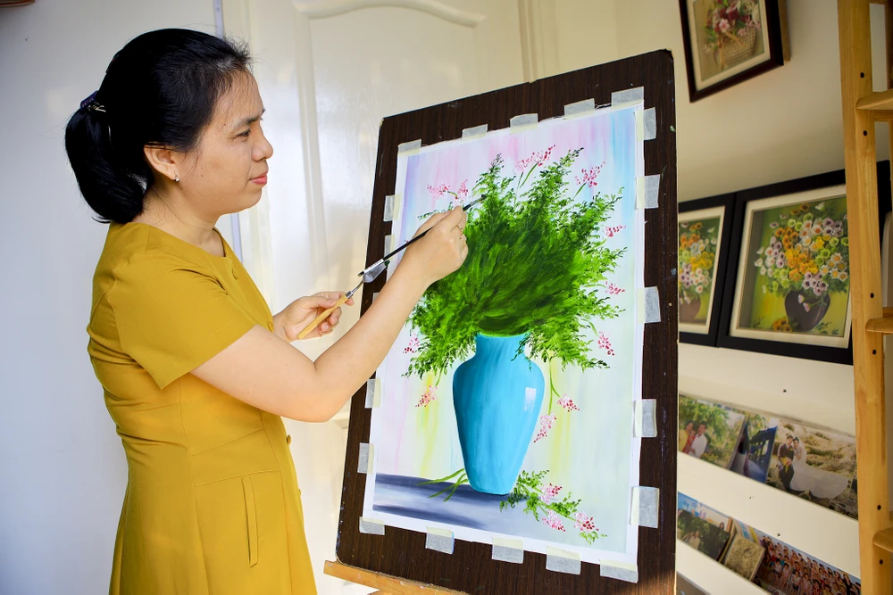 Chị Sinh xem việc làm tranh như cắm một bình hoa tươi.