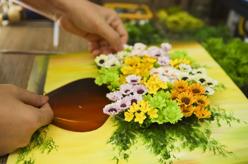 Cận Tết, chị Phạm Thị Giáng Sinh, 40 tuổi, ngụ phường Phước Long B, TP Thủ Đức, TP.HCM trở nên tất bật khi thực hiện nhiều bức tranh hoa đất sét để kịp giao cho khách.