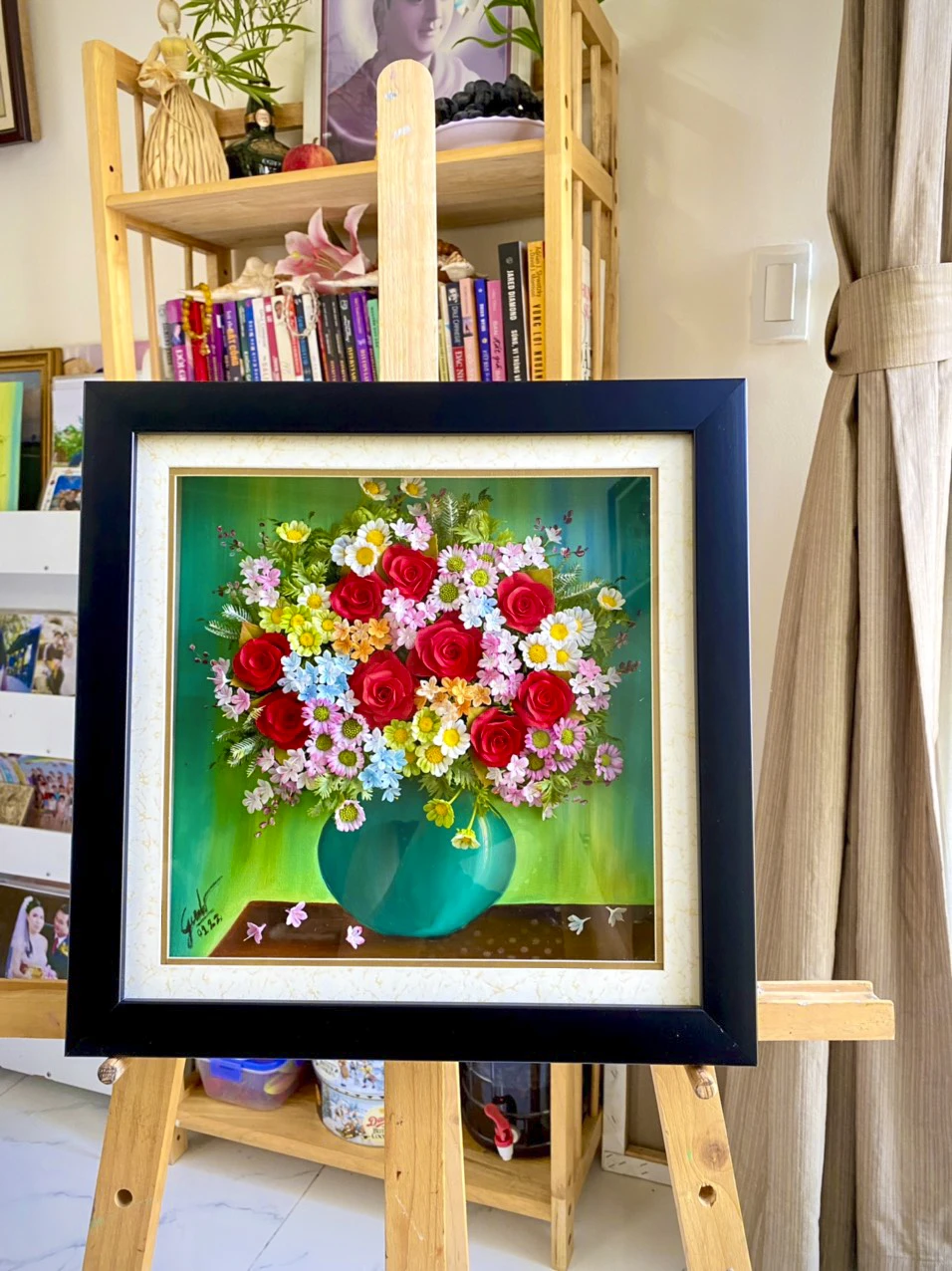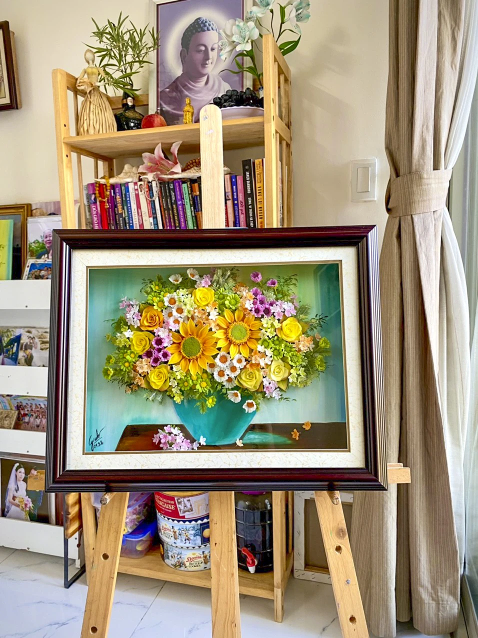 Một bức tranh hoàn thành được chị Sinh đóng khung, việc đính hoa lên tranh tạo cho người xem cảm giác chân thật hơn.