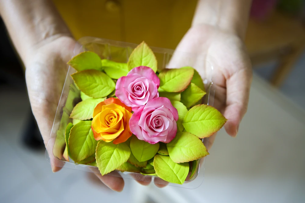 Để màu sắc của hoa bền và đẹp, chị Sinh trộn đất sét với màu sơn dầu. Hoa được chị nặn từng cánh rồi ghép lại với nhau. Chị chỉ dùng khuôn để tạo gân lá và làm nụ hoa.