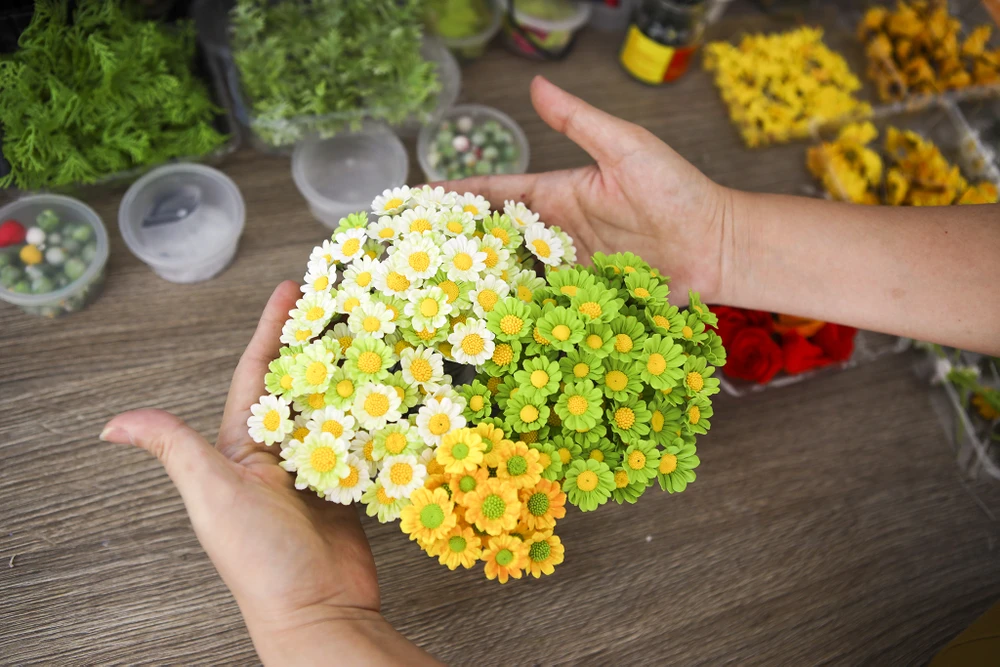 Những bông hoa đất sét có ưu điểm là nhìn giống hoa thật, bền màu, tươi tắn được chị Sinh làm hoàn toàn bằng tay.