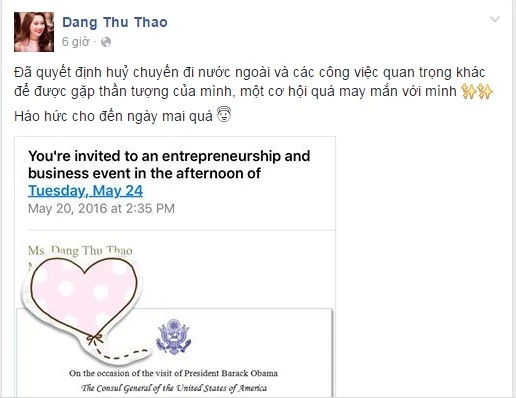 Cụ thể, cô viết: “Đã quyết định hủy chuyến đi nước ngoài và các công việc quan trọng khác để được gặp thần tượng của mình, một cơ hội quá may mắn với mình. Háo hức cho đến ngày mai quá”. Cùng với đó là hình ảnh thư mời của Tổng Lãnh sự Mỹ.