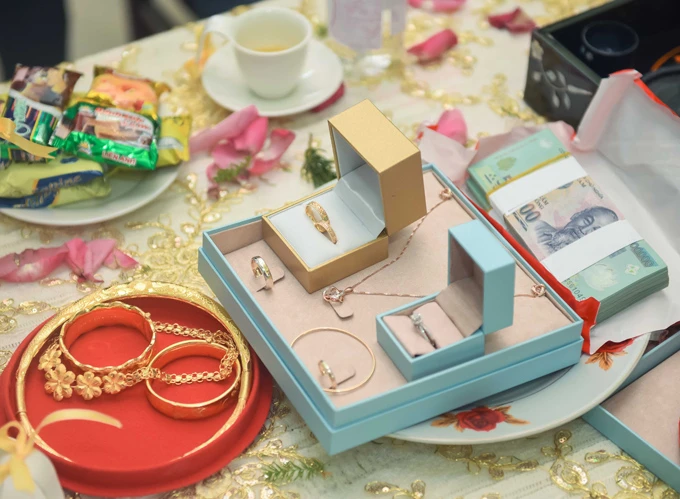 Cô dâu với những đồ vật trang trí lễ hỏi.