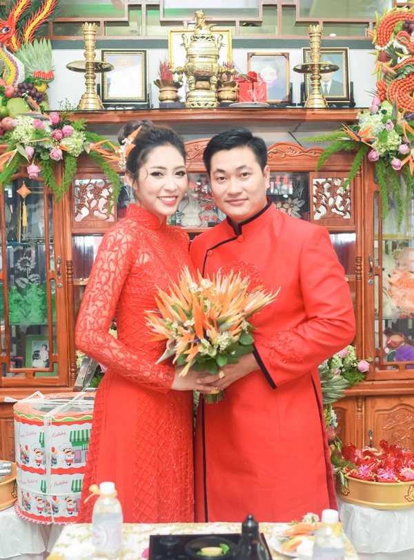 Cặp đôi Hoa hậu Đại dương Đặng Thu Thảo và phu quân cùng mặc áo dài đôi màu đỏ và sử dụng hoa cưới là hoa thiên điểu. Tham gia lễ đính hôn củaHoa hậu Đại dương Đặng Thu Thảo có những người bạn thân thiết như nam vương Cao Xuân Tài, á hậu Kim Nguyên, MC Bá Niên, nghệ sĩ Hoàng Mập, nam vương Duy Linh, MC Anh Quân, quản lý Duy Quách...