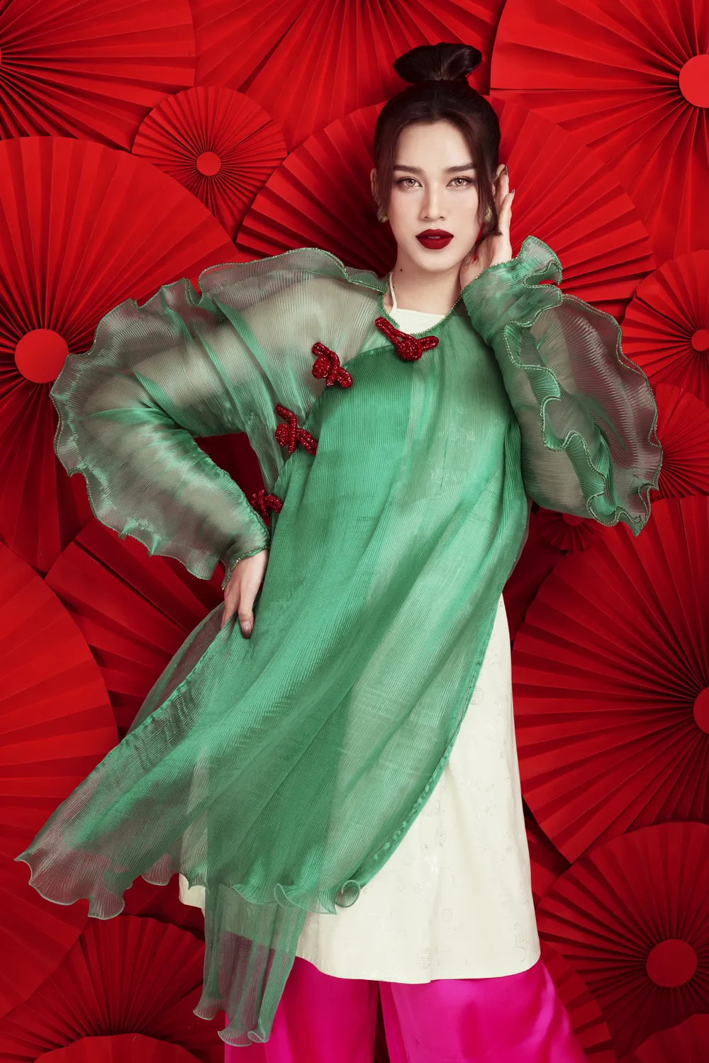 Tiếp đến là thiết kế cách tân đến từ nhà thiết kế Thủy Nguyễn, áo dài xanh lục với chất liệu xuyên thấu kết hợp cùng chiếc yếm trắng bên trong.