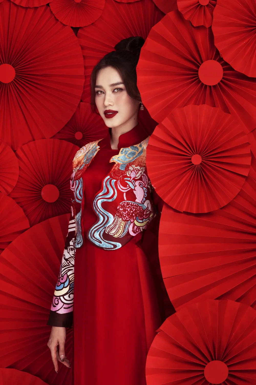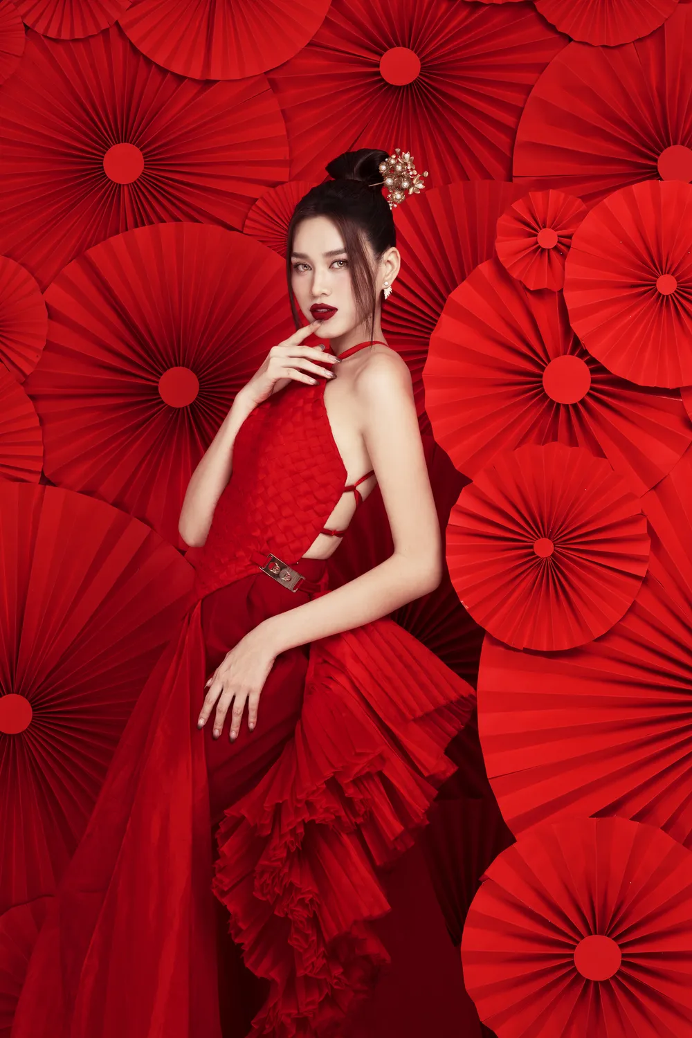 Đỗ Hà lựa chọn sắc đỏ làm tông màu chủ đạo cho bộ ảnh lần này của mình. Màu đỏ cũng là màu sắc tượng trưng cho sự may mắn, viên mãn rất phù hợp với không khí của những ngày đầu năm mới.