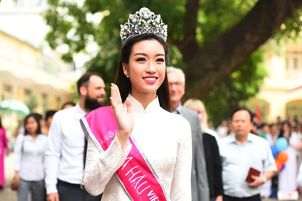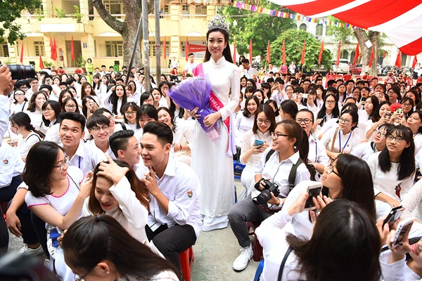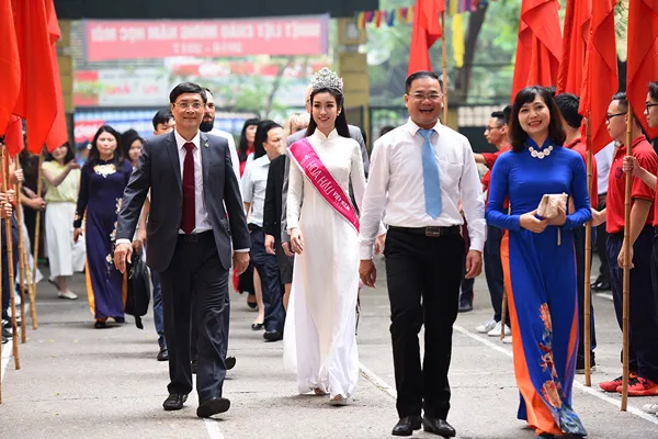 Mỹ Linh đã chọn chiếc áo dài trắng, trang điểm nhẹ nhàng cho phù hợp không khí khai giảng và không quên đội chiếc vương miện danh giá. Cô đã nhận được sự chào đón nồng nhiệt của các thầy, cô giáo và các em học sinh.