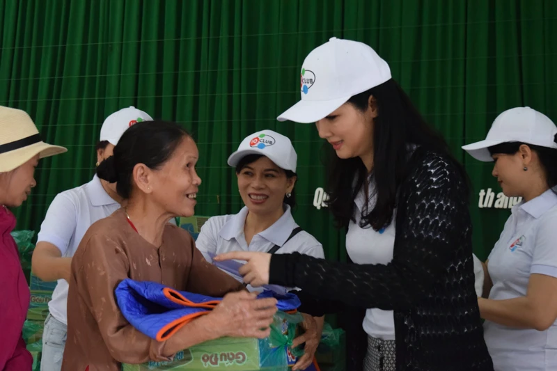 Tại đây, Hoa hậu Giáng My thăm hỏi và chia sẻ khó khăn mất mát mà người dân địa phương phải gánh chịu từ bão lũ vừa qua. Đoàn đã tặng cho người dân bị thiệt hại do lũ 300 suất quà.