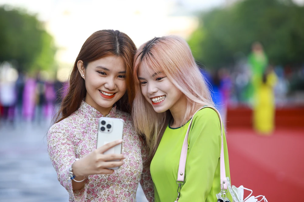 Thanh Tâm, 20 tuổi (trái) sinh viên Trường Cao đẳng Kinh tế TP.HCM mặc chiếc áo dài hoa đến lễ hội. "Chiếc áo này là của mẹ em, nó đã có hơn 10 năm, em rất bất ngờ khi mình có thể mặc vừa áo dài của mẹ. Em rất yêu quý áo dài đặc biệt là chiếc áo này, dù nó cũ nhưng với em nó vẫn rất thanh lịch." - Tâm chia sẻ.