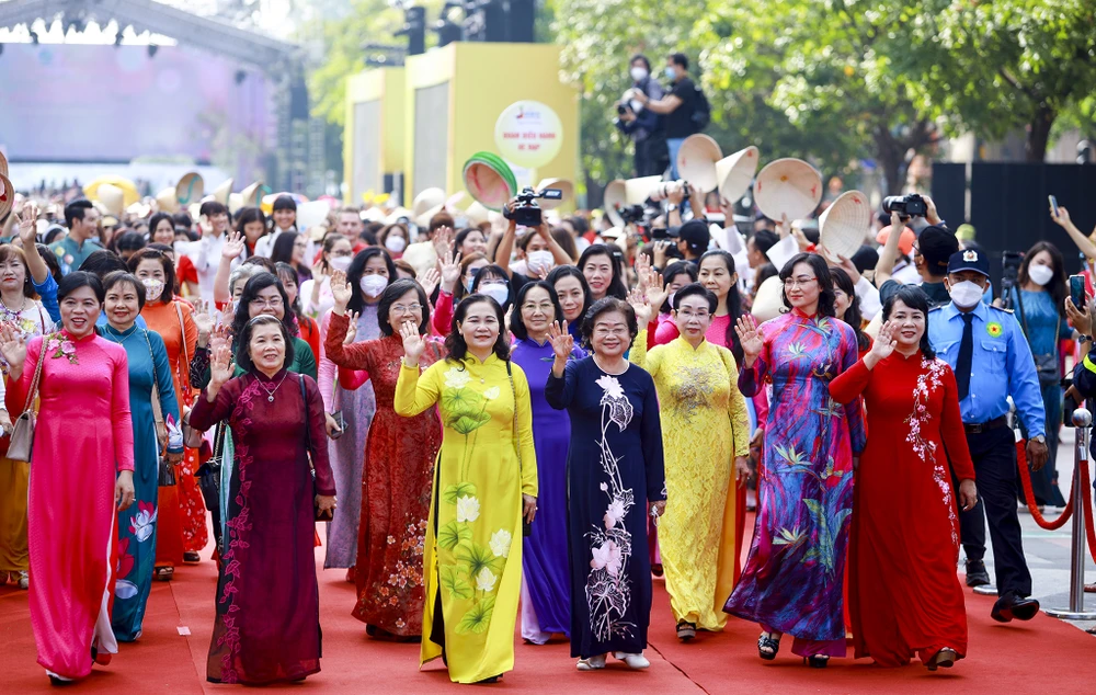Từ hơn 7h sáng, nhiều người dân đã có mặt tại phố đi bộ Nguyễn Huệ để hòa chung không khí với ngày hội. Hơn 8h, đoàn diễu hành dẫn đầu là các lãnh đạo, nguyên lãnh đạo diện những mẫu áo dài với thiết đa dạng tôn vinh vẻ đẹp truyền thống.