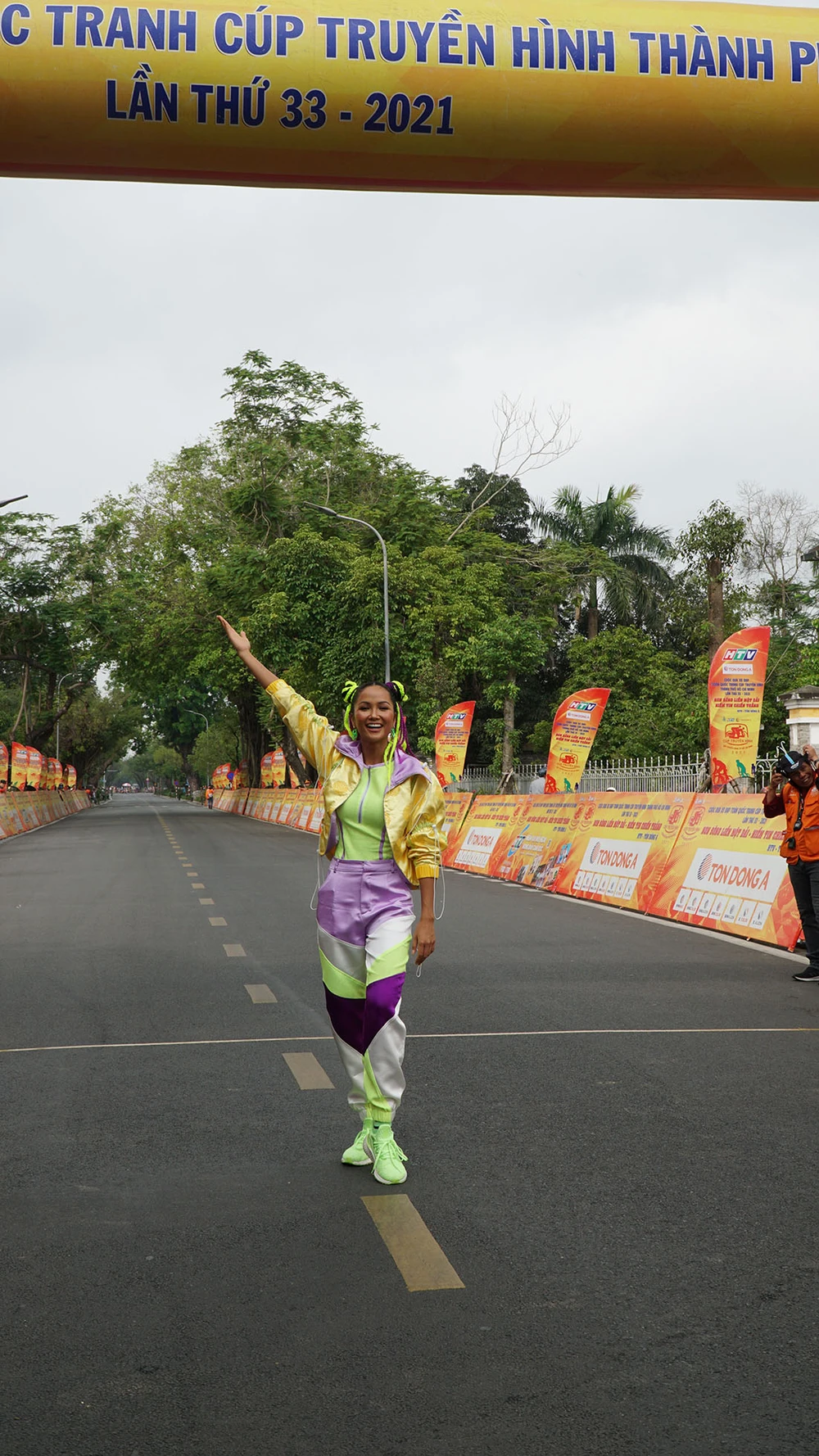 Mới đây khi đồng hành cùng cuộc đua xe đạp tranh cúp truyền hình HTV 2021 trong chặng đua ở Huế, Hoa hậu H’Hen Niê tiếp tục gây ấn tượng với khán giả bằng kiểu tóc tết hai búi, đồ thể thao năng động, khoẻ khoắn.