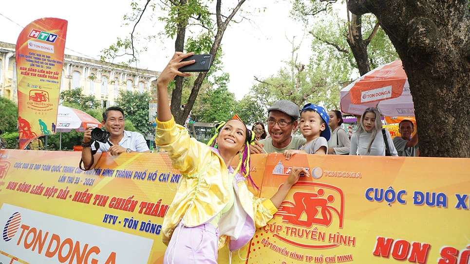 H’Hen Niê chụp ảnh cùng các khán giả nhí tại đường đua. Ảnh: ĐẠT NGUYỄN