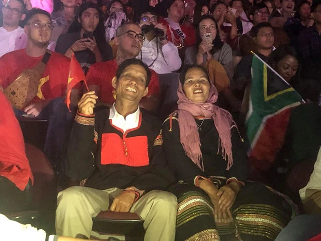 Cha mẹ H'Hen Niê cổ vũ con gái ở khán đài. Ảnh: Zing