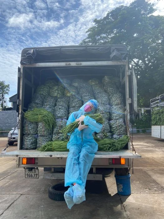 Hoa hậu Khánh Vân cùng mẹ chở rau đến các khu cách ly. Ảnh: FBNV.
