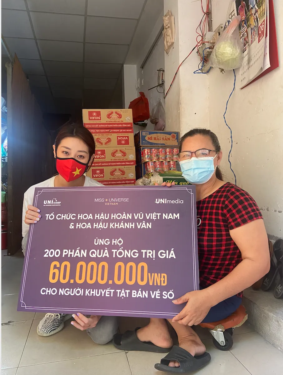 Mới đây, Hoa hậu Khánh Vân và tổ chức Hoa hậu Hoàn vũ Việt Nam đã ủng hộ 200 phần quà cho người khuyết tật, bán vé số.