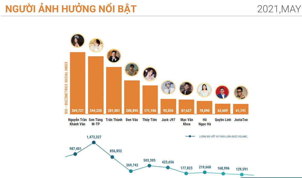 Theo bảng xếp hàng này, 10 người có ảnh hưởng nổi bật trên mạng xã hội trong tháng 5 gồm: Hoa hậu Khánh Vân, Sơn Tùng M-TP, Trấn Thành, Đen Vâu, Thủy Tiên, Jack, Mạc Văn Khoa, Hồ Ngọc Hà, Quyền Linh và Justa Tee.