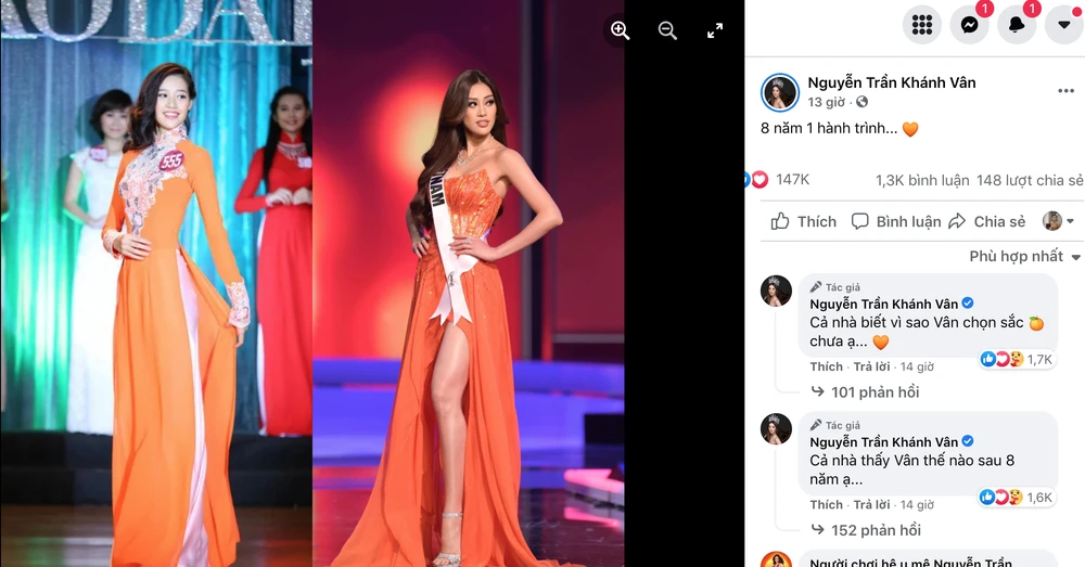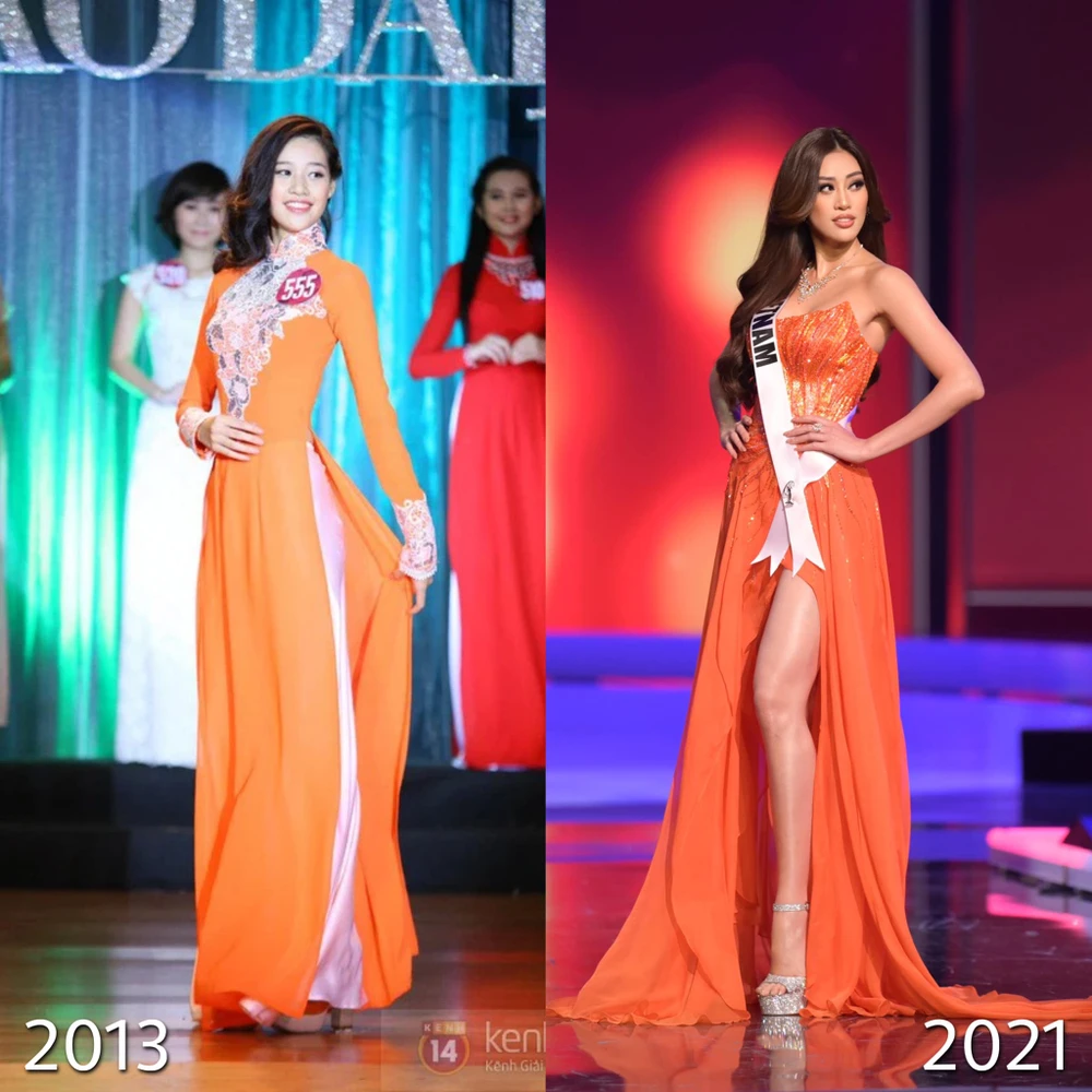 Bức ảnh ở hai thời điểm: Khánh Vân thi Hoa khôi áo dài (2013) và Khánh Vân tham dự Hoa hậu Hoàn vũ thế giới(2021). Bức ảnh nhỏ với dòng trạng thái ngắn gọn nhưng đó là cả hành trình không mệt mỏi. Và có một đặc điểm chung giữa hai bộ trang phục đó là đều màu cam.
