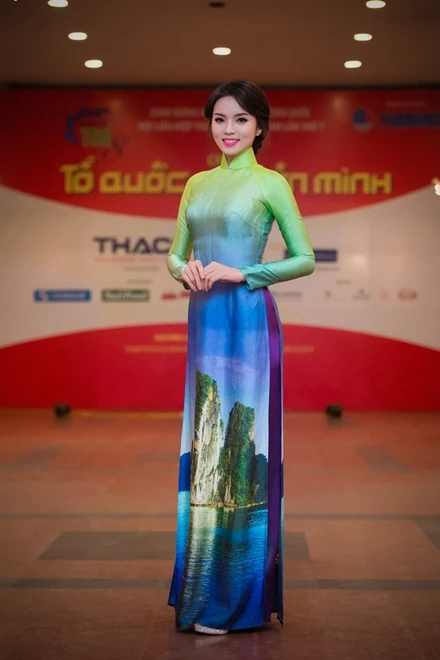 Kỳ Duyên chọn áo dài in hình vịnh Hạ Long nền nã với gam xanh chuyển màu.