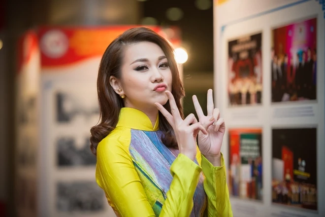 Á hậu Huyền My cũng chọn một tà áo dài gam xanh giống Kỳ Duyên.