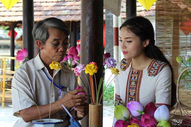 Kỳ Duyên được người nghệ nhân lớn tuổi hướng cách làm hoa giấy truyền thống