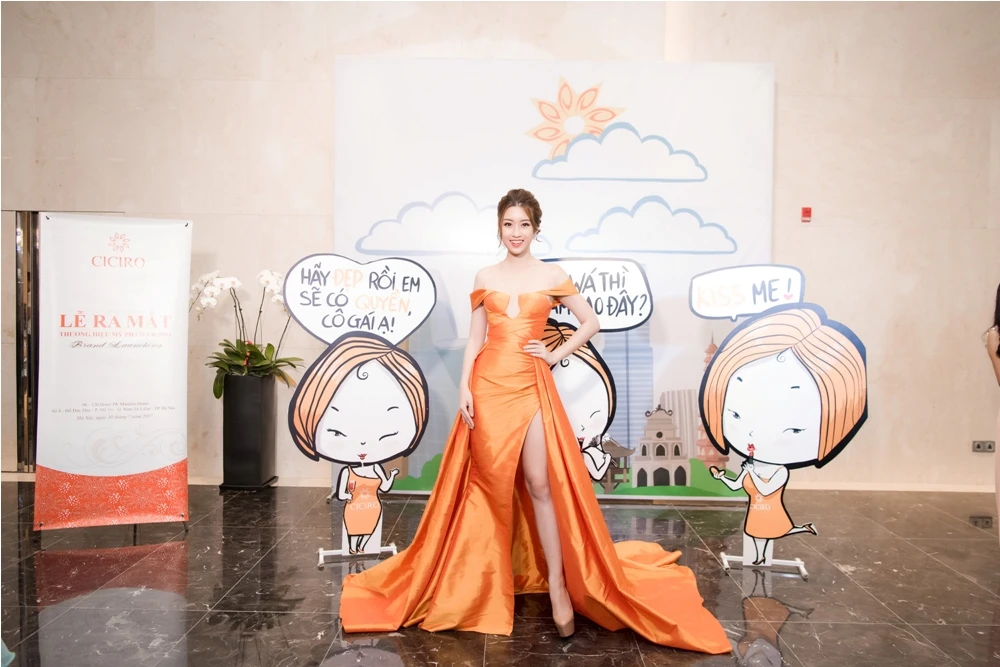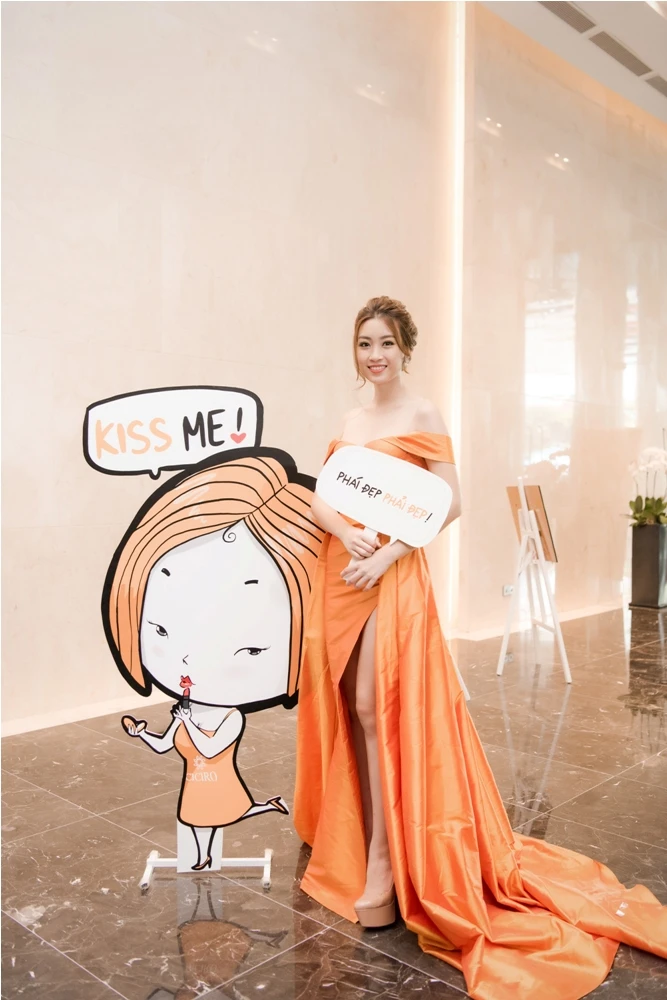 Hoa hậu Đỗ Mỹ Linh diện chiếc đầm màu da cam hở vai. Dù không sở hữu thân hình đầy đặn nhưng Mỹ Linh đã khéo léo lựa chọn chiếc váy này để tôn làn da trắng cũng như những đường cong cơ thể. Cô thu hút quan khách bởi sự thân thiện và nụ cười tươi