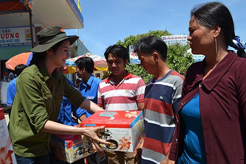 Hoa hậu Ngọc Hân tặng quà cho ngư dân Lý Sơn.