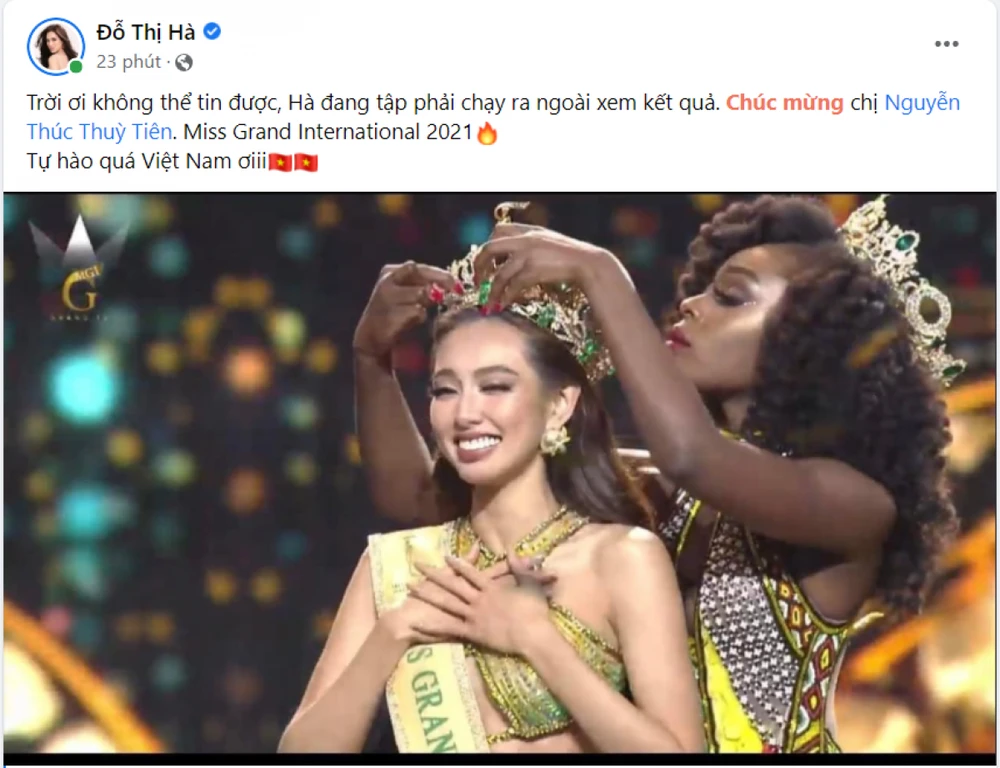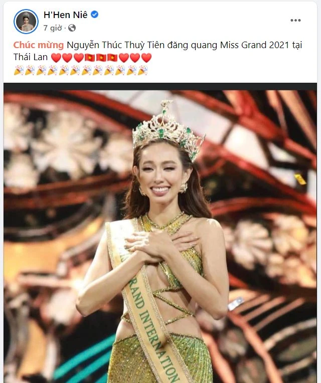 Theo đó, ngay khi Thuỳ Tiên vừa được gọi tên cho ngôi vị cao nhất tại Miss Grand International 2021, trên trang cá nhân Hoa hậu H'hen Niê đã nhanh chóng đăng tải dòng trạng thái để chúc mừng đàn em.