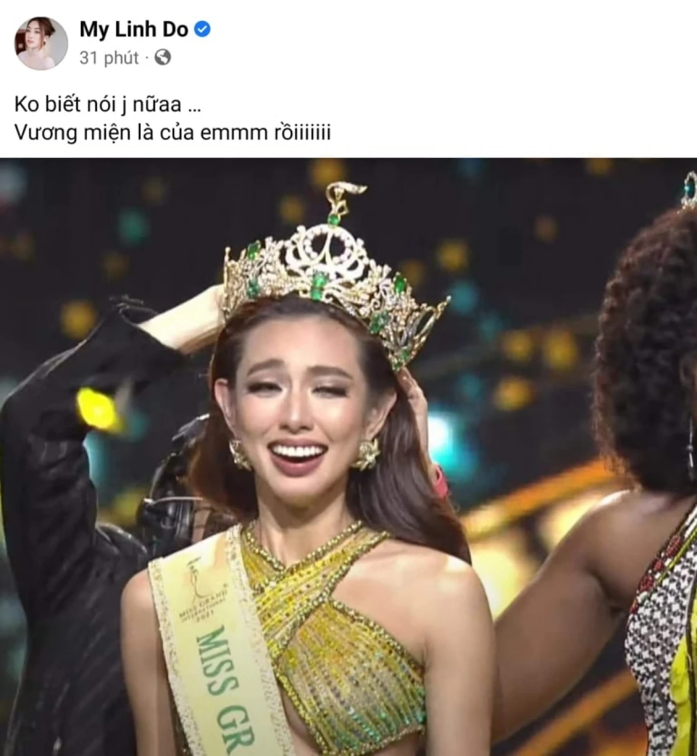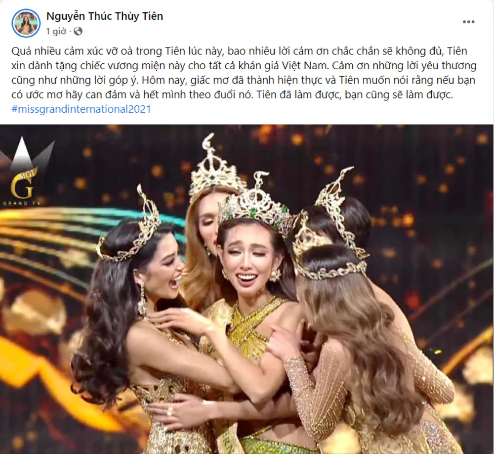 Ngay sau đêm chung kết Miss Grand International 2021 kết thúc, Thùy Tiên cũng đã chia sẻ cảm xúc và gửi lời cám ơn của cô trên mạng xã hội sau khi giành vương miện.