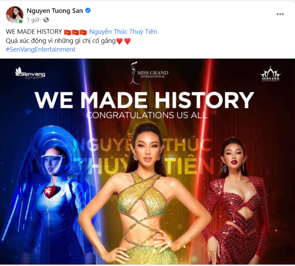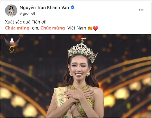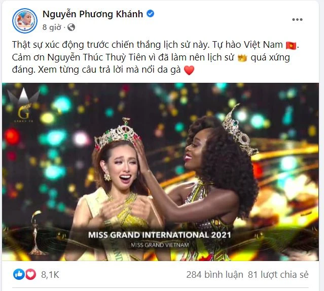 Hoa hậu Nguyễn Phương Khánh viết: “Thật sự xúc động trước chiến thắng lịch sử này. Tự hào Việt Nam. Cảm ơn Nguyễn Thúc Thuỳ Tiên vì đã làm nên lịch sử quá xứng đáng. Xem từng câu trả lời mà nổi da gà”.