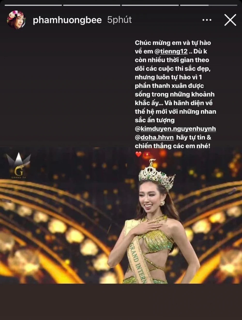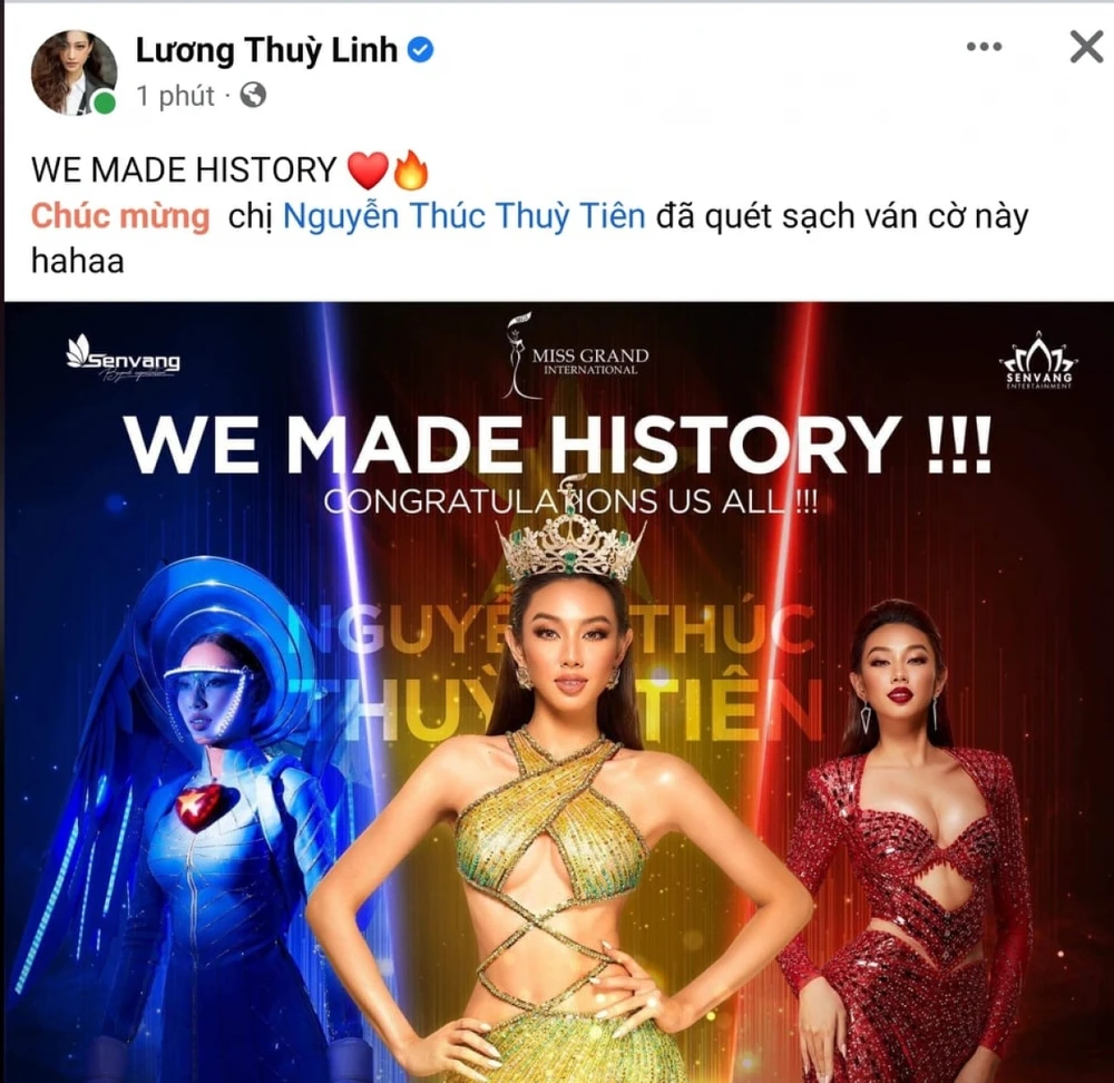 Trên các trang mạng xã hội, nhiều hoa hậu người đẹp đã đăng tải bài viết chúc mừng thành tích tuyệt vời của Thuỳ Tiên.