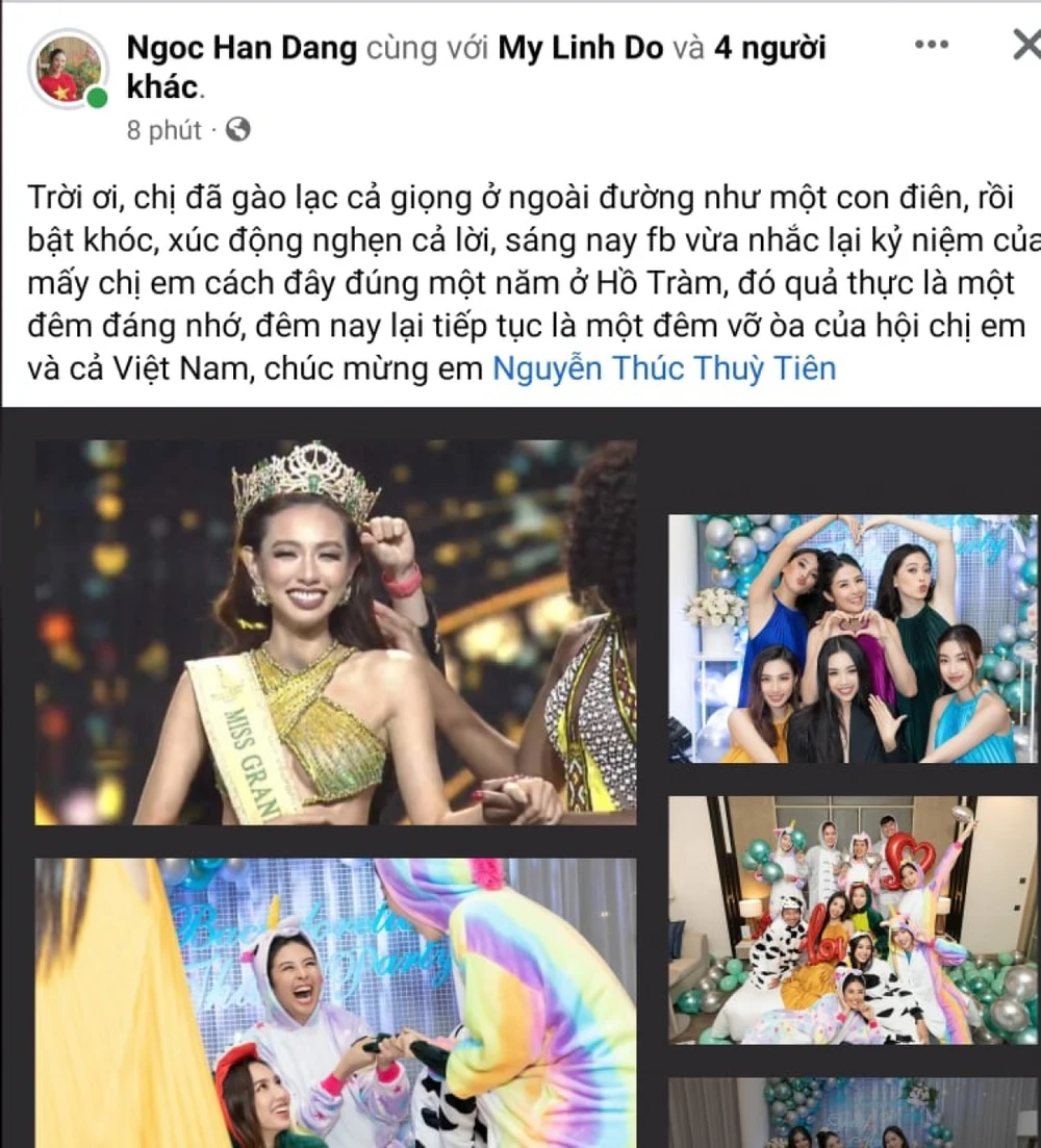 Hoa hậu Ngọc Hân đã chia sẻ những cảm xúc và gửi lời chúc mừng mừng khi Thuỳ Tiên đăng quang Miss Grand International 2021. Bên cạnh đó, Ngọc Hân cũng nhắc lại kỷ niệm đáng nhớ với Thùy Tiên.