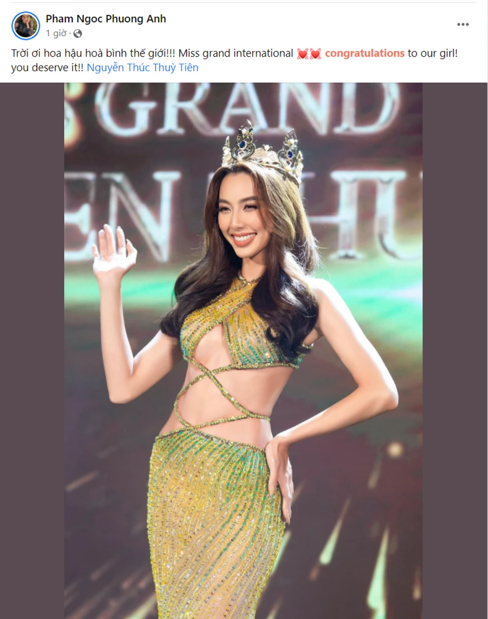Thuỳ Tiên đăng tải bài viết sau khi đăng quang Hoa hậu Miss Grand International 2021. Ảnh: FBNV