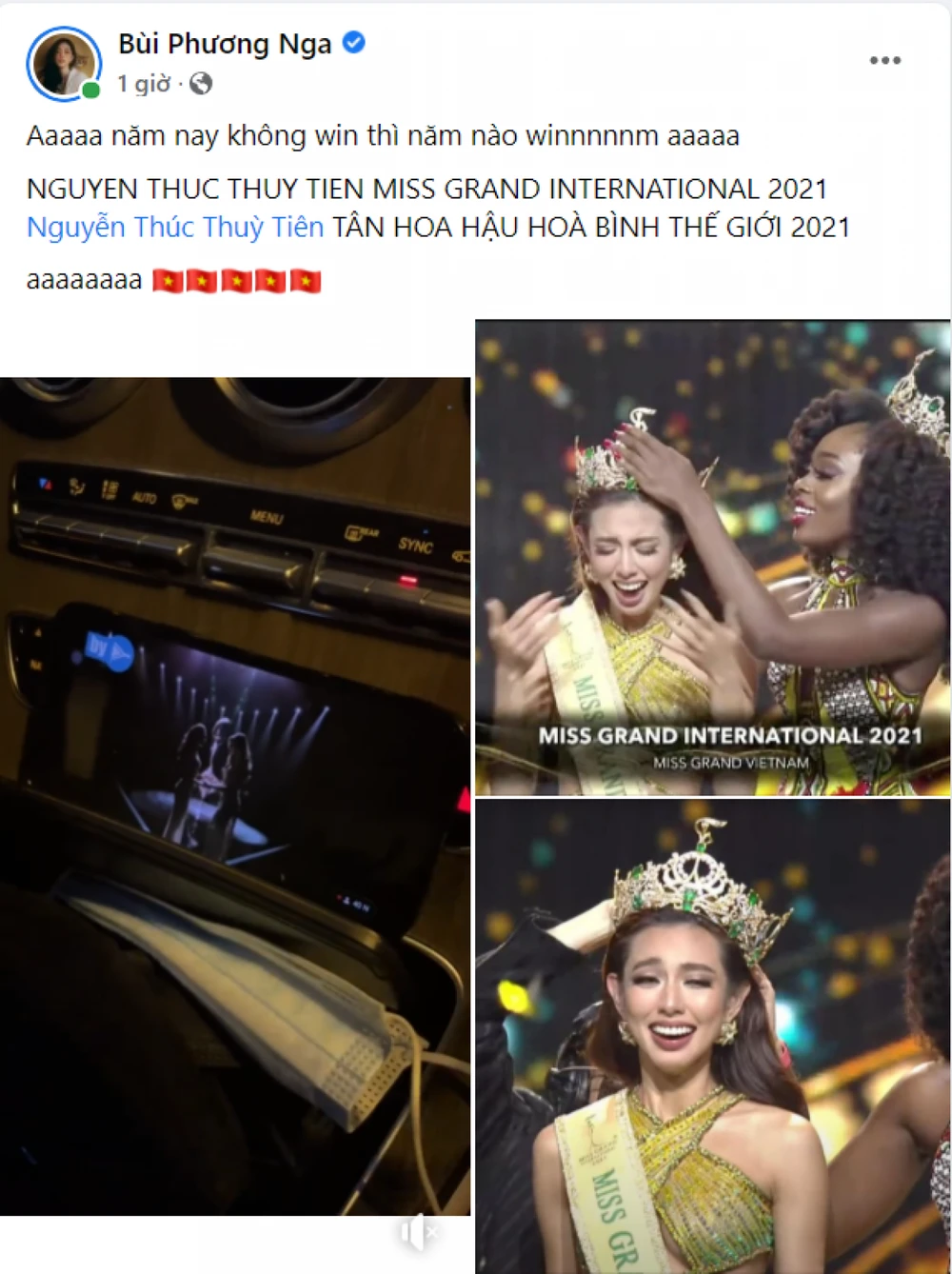 Á hậu Phương Nga cũng vô cùng phấn khích khi chia sẻ lại clip cô xem qua màn hình nhỏ giây phút xướng tên đăng quang của Thùy Tiên.