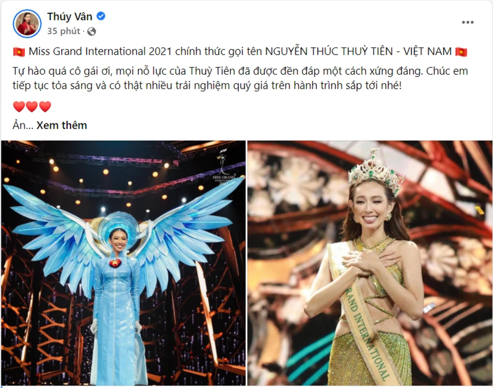 Á hậu Thúy Vân bày tỏ sự tự hào về những điều Thuỳ Tiên đã làm được và chúc mừng thành tích của người đẹp tại Miss Grand International 2021.