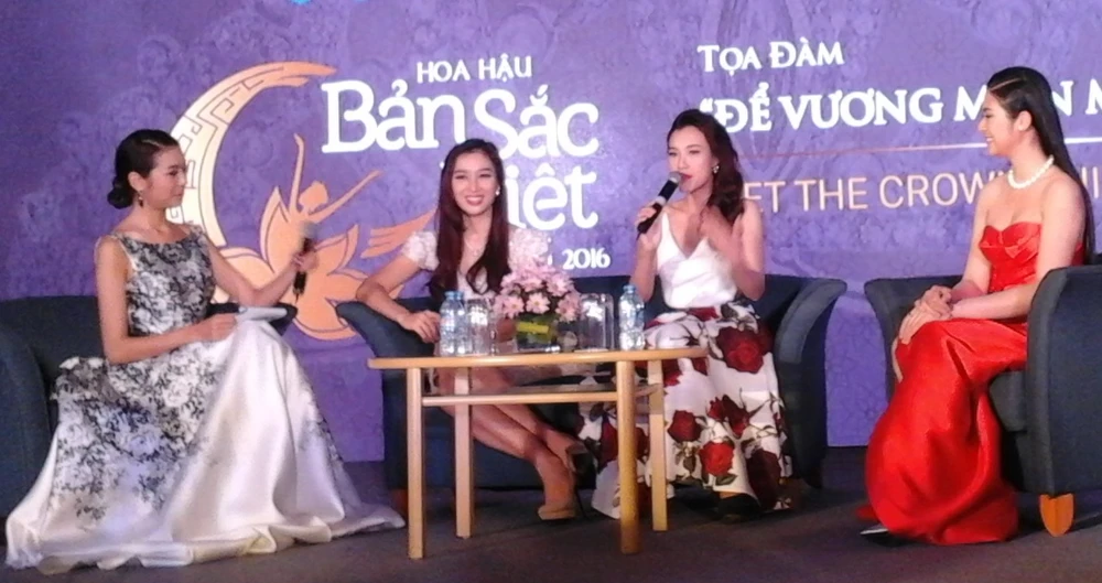 Từ trái sang: Á hậu Hoa hậu Quốc tế Thúy Vân, á hậu Hoa hậu Quý bà thế giới - Hoa khôi Thể thao Thu Hương, á hậu Hoàng Oanh - Hoa hậu Phụ nữ Việt Nam qua ảnh, hoa hậu Việt Nam Ngọc Hân tọa đàm về sắc đẹp tỏa sáng tại họp báo.