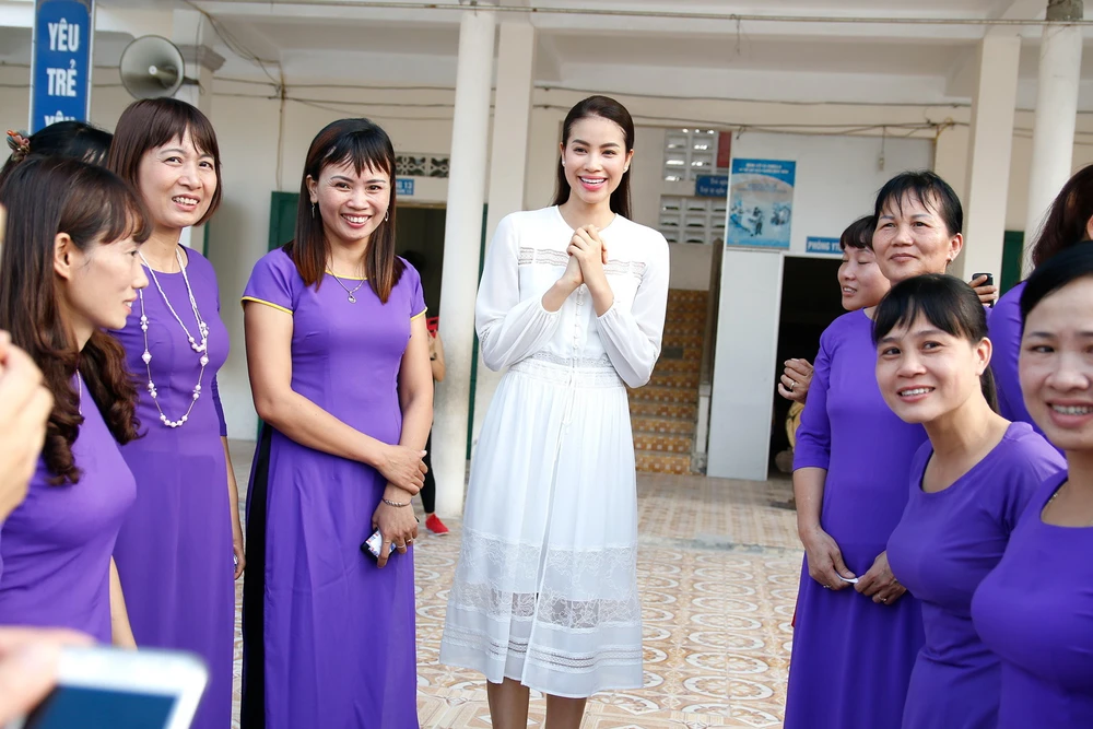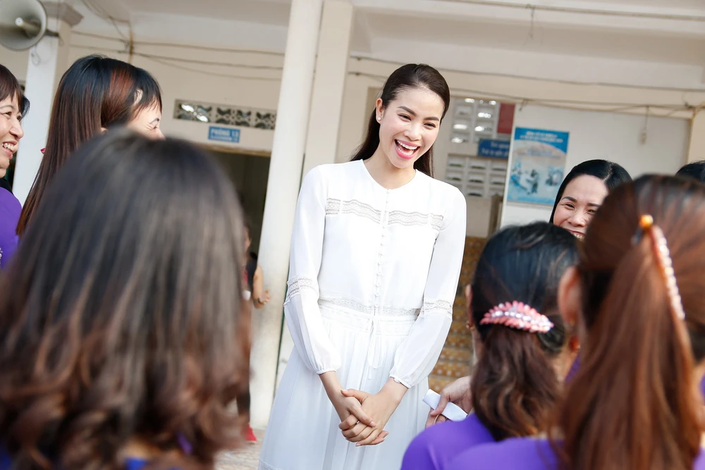 Cũng chính vì lớn lên trong gia cảnh khó nghèo đó, Phạm Hương đã quyết chí học hành để vươn lên. Đó cũng là điều tân hoa hậu chia sẻ với các em học sinh nơi đây.