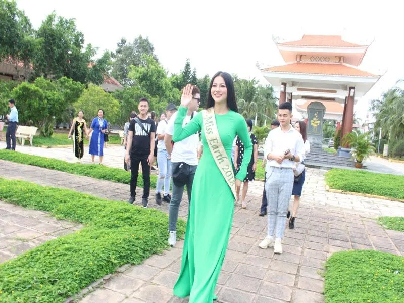 Rạng rỡ trong trang phục áo dài xanh lá, Phương Khánh đã đến dâng hoa, thắp hương báo công tại đền thờ nữ tướng Nguyễn Thị Định ở xã Lương Hòa, huyện Giồng Trôm, tỉnh Bến Tre.