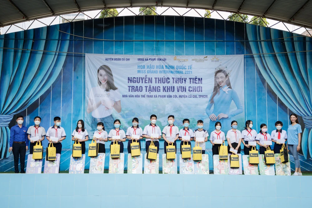 Được biết, bên cạnh khu vui chơi tại Nhà Văn hóa Thể thao, Hoa hậu Thùy Tiên còn trao tặng thêm 30 suất học bổng cho các em học sinh nghèo hiếu học và 53 phần quà gồm như yếu phẩm như gạo, nước mắm... cho bà con có hoàn cảnh khó khăn.