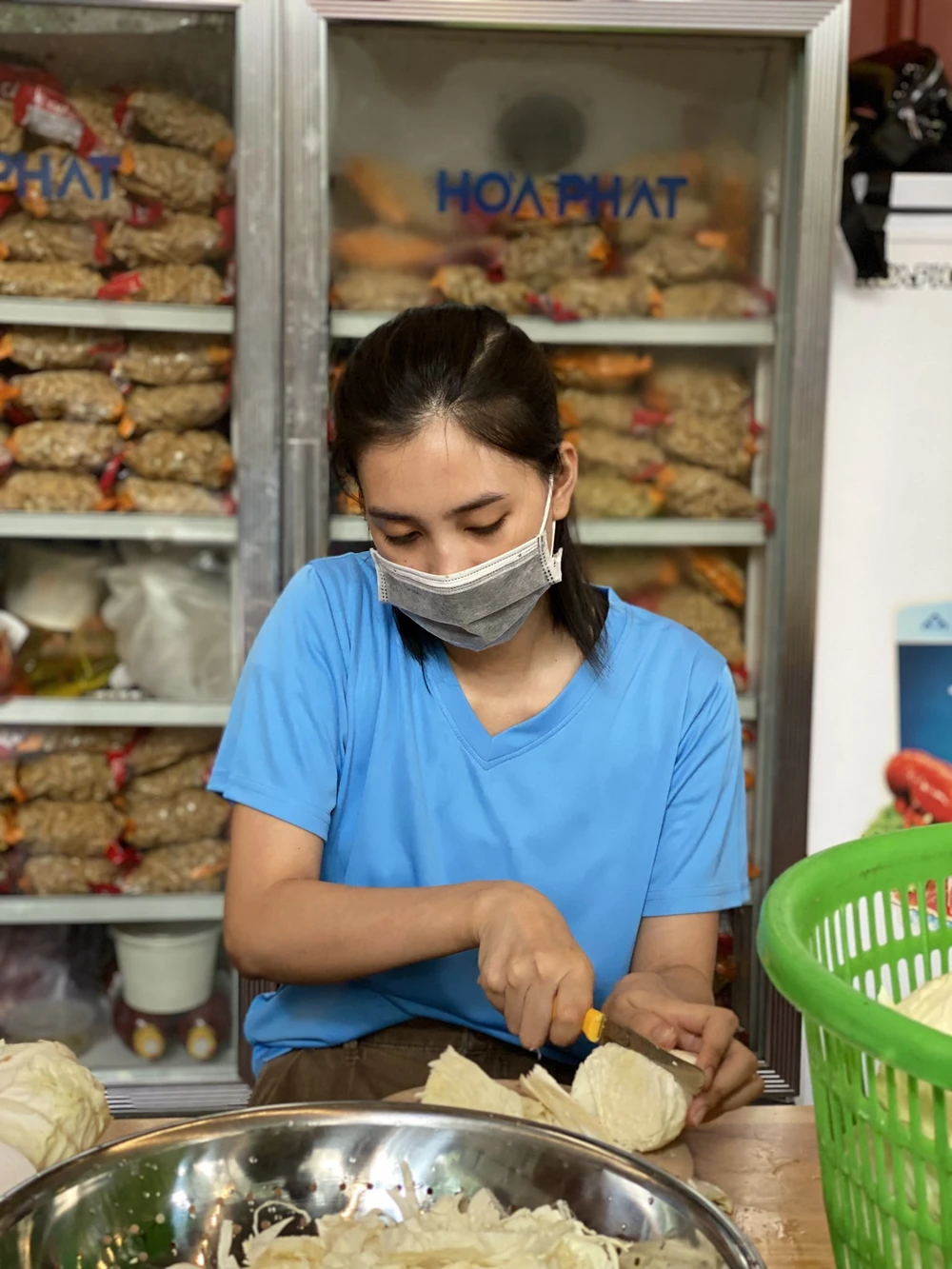 Tiểu Vy dùng bữa sau một buổi nấu cơm tiếp sức cho cán bộ và người dân Sài Gòn chống dịch. Ảnh: FBNV